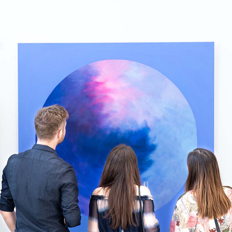 Magdaléna Ševčík is a professional abstract painter. She is one of the most prominent representatives of young Czech abstract painting and has exhibited her work in Czechia, Germany, Slovakia, the Netherlands, the UK and Japan.She is interested in the topic of the human mind and its representations through perception, which she interprets and explores in large scale paintings and playful installations.Her compositions examine hidden possibilities, and extensions or flaws of the human brain, in memory, self-control and regulation, entanglement, and a higher self. Ševčík uses acrylic paints, always choosing a specific set of colors, she explores how they mix and blend, how they express what can’t be expressed by words or other actions. Her visual language is expressive and symbolic. The fluid background tells a story and speaks of strong moments and experiences. It follows a certain topic in a free and flowing manner. Her work is subjective and raw. On the other hand, the foreground introduces a certain rationality with its simple forms, sharp lines and ellipses. Without them the artwork is incomplete. They either support and amplify what’s happening in the background or negate it completely.